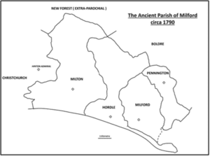 The geographic scope of our new search aids reaches far beyond present day Milford. The ancient parish of Milford comprised Milford church and three chapels: Hordle, Milton and Pennington. The parish included the surrounding settlements of Arnewood, Ashley, Barton, Chewton, Efford, Everton, Highcliffe, Hordle, Keyhaven, Lymore, New Milton, Pennington, and Tiptoe.