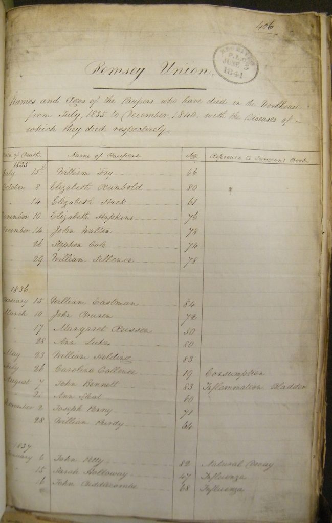 For the Romsey Union, for example, the best sources of names that have survived is the Register of Deaths (HRO, PLV/9.3) and Romsey Union Out-door Relief Lists (catalogued under several references). In addition TNA at Kew holds lists of people who were assisted to emigrate, particularly around 1840 (MH 12/10983).